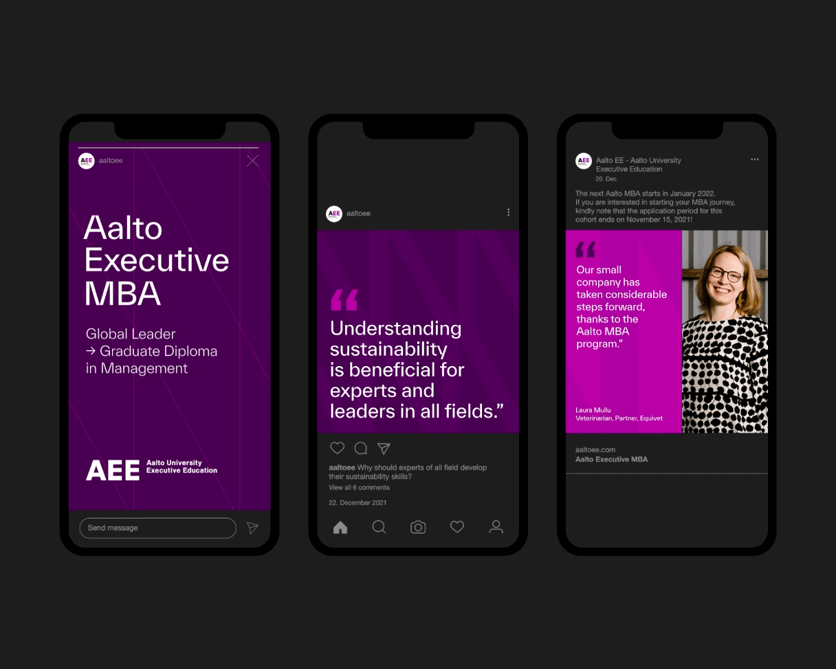 Yksi pitkäaikaisimmista asiakkaistamme, Aalto University Executive Education tarvitsi brändi-identiteettinsä uudistamista, jotta se vastaisi samoja korkeita vaatimuksia, joilla se toimii yhtenä maailman arvostetuimmista johtamiskoulutuksen tarjoajista.
